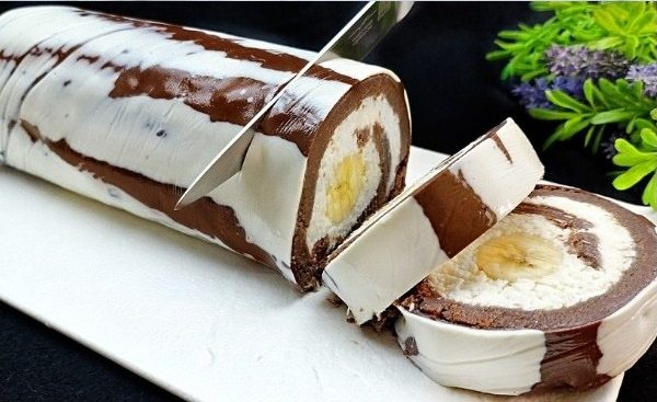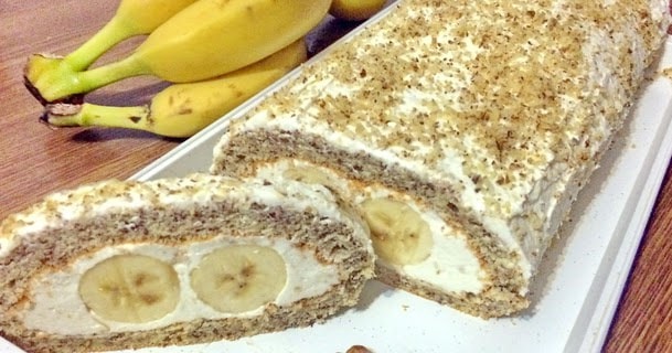 2. Na jedan kraj biskvita stavite dvije narezane banane, a zatim pažljivo urolajte biskvit.