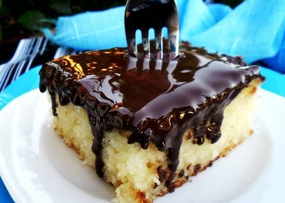 Vruć kolač u tepsiji narezati na kocke i preliti.