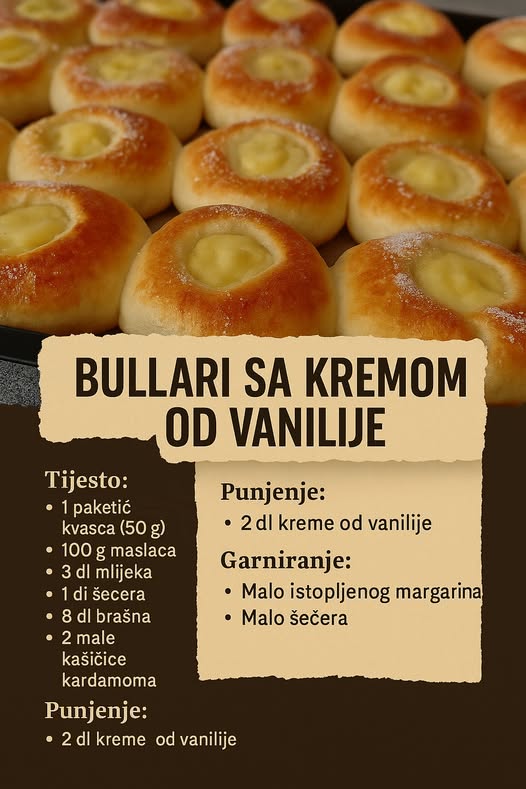 6️⃣: Kuglice slažite u pleh obložen papirom za pečenje i ostavite da odstoje 15 minuta. 7️⃣: U sredini svake kuglice napravite udubljenje i napunite ga kremom od vanilije.