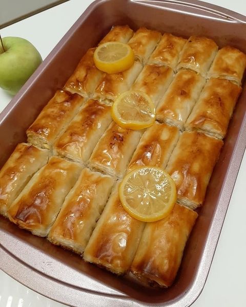 Odaberite tepsiju po želji (ja lično preferiram pravougaonu tepsiju radi lakšeg rezanja). Položite 4-5 jufki jednu na drugu, pazeći da je svaka premazana puterom. Pospite smjesu kao što je prikazano na slici, a zatim savijte jufku u rolat.