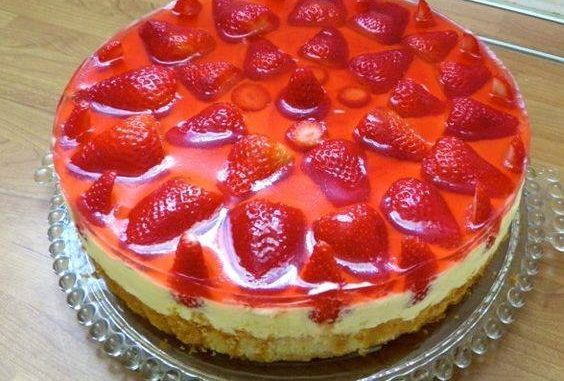 Kremu ravnomjerno rasporediti po biskvitu, pa na kremu poslagati jagode ili višnje. Po želji preliti crvenim preljevom za torte i ostaviti smjesu da odstoji u kalupu u hladnjaku nekoliko sati.