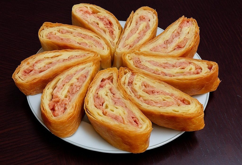 Nastavite postupak s ostalih šest listova. Rolice namažite smjesom od vrhnja i jaja, pa ih stavite u podmazan pleh. Pecite na 200 stupnjeva oko 20 minuta, odnosno dok ne dobiju ugodnu zlatno smeđu boju.