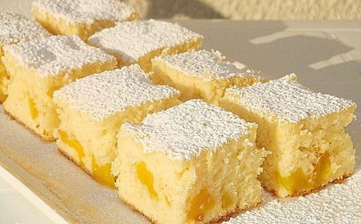 * Komadiće breskve ili trešnje ravnomjerno rasporedite po površini tijesta. * Stavite u prethodno zagrijanu pećnicu na 190°C i pecite oko 30 minuta, odnosno dok kolač ne dobije zlatnosmeđu boju.