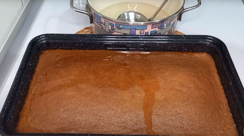 Dok se kolač peče, pripremite agdu. U manjoj posudi prokuhajte 2 čaše šećera sa 2 čaše vode 2-3 minute. Kada je kolač pečen, prelijte ga vrućom agdom kako bi upio šećerni sirup i postao još sočniji. Ovaj korak je ključan za postizanje savršenog okusa, jer agda dodatno pojačava slatkoću i sočnost kolača. Možete dodati i nekoliko kapi limunovog soka u agdu kako biste postigli ravnotežu okusa.