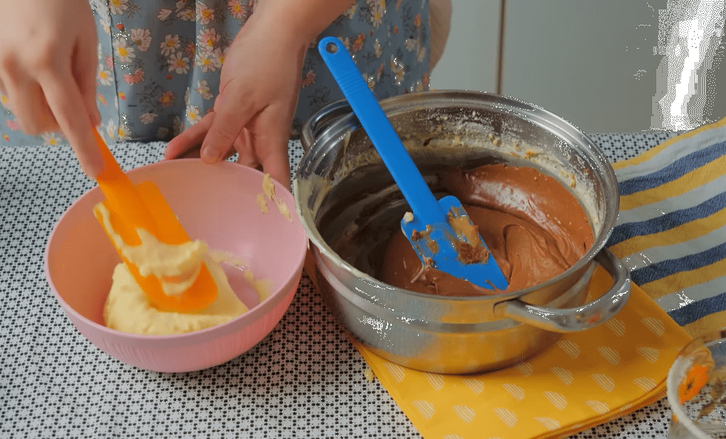 - Podjela smjese: Sada podijelite smjesu u dva dijela. U jedan dio dodajte istopljenu bijelu čokoladu, a u drugi crnu čokoladu. Dobro promiješajte svaki dio posebno kako bi se čokolada ravnomjerno rasporedila. Ova raznolikost okusa učinit će vašu slasticu još zanimljivijom.