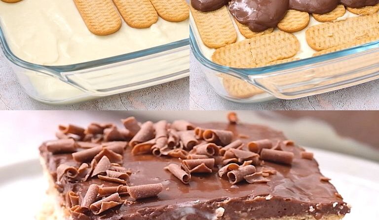 Zatim dodajte polovicu čokoladne kreme i prekrijte još jednim slojem natopljenih keksa. Na kraju, prelijte preostalim bijelim i čokoladnim kremama, ravnomjerno ih raspoređujući po površini.