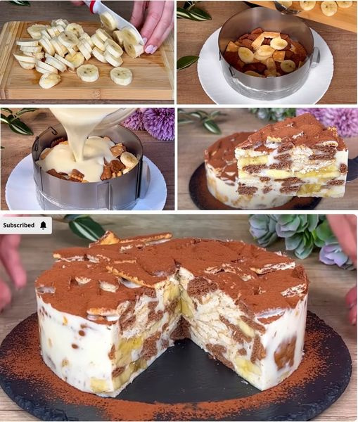 Za ukusan desert pomiješajte 2 banane, 25 g želatine sa 100 ml vode ili mlijeka, 100 g vanilin keksa, 100 g čokoladnih keksa, 300 g grčkog jogurta i 300 g zaslađenog kondenziranog mlijeka.