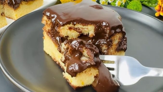 - Nakon što je kolač pečen, izvadite ga iz pećnice i vrhom vilice izbodite površinu. Prelijte otopljenom čokoladom i stavite u hladnjak da se stegne.