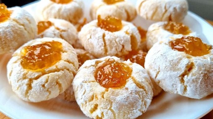 Nakon što su se kolačići ohladili, možete ih napuniti narandžinim džemom. Koristeći malu kašičicu, pažljivo napunite svako udubljenje džemom, vodeći računa da ne prepunite, jer bi to moglo uzrokovati curenje tokom pečenja. Ovi kolačići su savršeni za posluživanje uz čaj ili kafu i idealni su za razne prigode, od rođendana do slavlja, a čak su i odlični za poklon uz domaći džem ili čaj. Njihova elegantna forma i zlatna boja sigurno će privući pažnju svih koji ih vide.