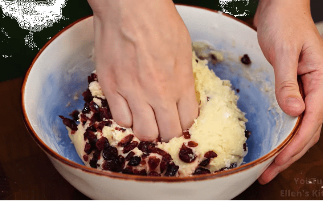 Nakon toga, umiješajte jaje i dobro izmiješajte dok se svi sastojci ne sjedine. Zatim, dodajte kiselo vrhnje u smjesu i miješajte dok ne dobijete glatku podlogu. U drugoj zdjeli, pomiješajte brašno, prašak za pecivo i sol. Postepeno dodajte ovu suhu smjesu u mokru, lagano miješajući dok se sve ne sjedini, pazeći da ne pretjerate s miješanjem. Kada je smjesa gotova, lagano umiješajte sušene brusnice ili grožđice u tijesto, osiguravajući da su ravnomjerno raspoređene.