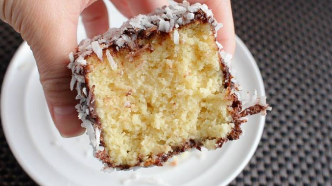 Stavite kokos u duboku posudu. Uronite kockice biskvita u umak, pazeći da ih okrenete kako bi dobro upile čokoladu sa svih strana (uz pomoć valjka za tijesto). Pustite da se višak umaka ocijedi prije nego kockice prebacite na tanjur s kokosovim brašnom, pazeći da se kokos zalijepi za sve površine.