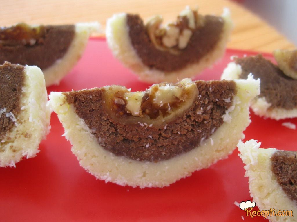 Pomiješajte šećer i vodu u loncu i zakuhajte. Nakon par minuta kuhanja dodajte margarin i pustite da se otopi. Kad se margarin otopi umiješati mljeveni keks i tamni kakao. Sve dobro izmiješajte mikserom dok smjesa ne postane homogena. Ostaviti da se ohladi. Smokve stavite u mlaku vodu nekoliko minuta da omekšaju. Zatim ih ocijedite i pažljivo napunite cijelim orasima. Svaku smokvu treba napuniti sa nekoliko oraha. Uzmite svaku smokvu punjenu orasima i premažite smeđom smjesom. Sve smokve stavite na tanjur i ostavite u hladnjaku 30 minuta da se ohlade i stisnu.