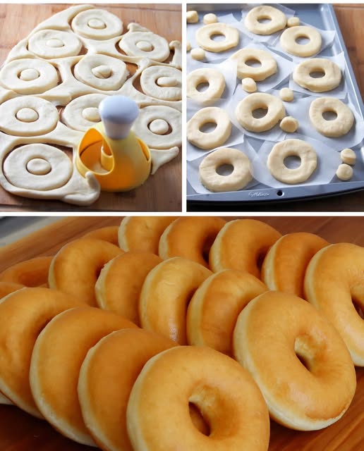 Nakon što je tijesto naraslo podijelite ga na dva jednaka dijela. Jedan dio razvaljajte na oko 0,6 cm debljine. Rezačem za krafne promjera 7,5 cm izrežite što više krafni i središta (rupica).
