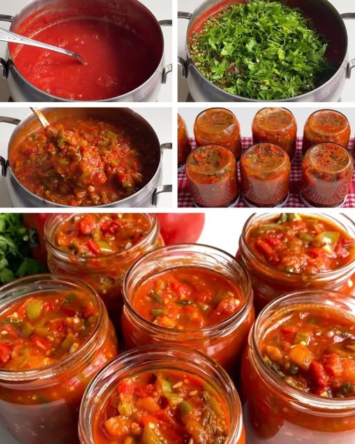 Zatim papriku narežite na krupne kockice, a mrkvu na kolutove. U smjesu rajčice i luka dodajte mrkvu, papriku, nasjeckani češnjak, sol, šećer, ocat, ulje i lovorov list. Provjerite jesu li svi sastojci dobro povezani i pustite da se smjesa kuha oko sat do sat i pol uz povremeno miješanje. Na kraju dodajte sitno nasjeckani peršin i dobro promiješajte prije nego sadržaj prebacite u staklenke.