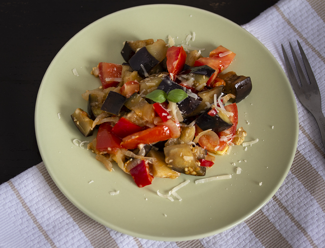 5. **Patlidžan** – Dodajte kockice patlidžana i lagano pržite 4-5 minuta.