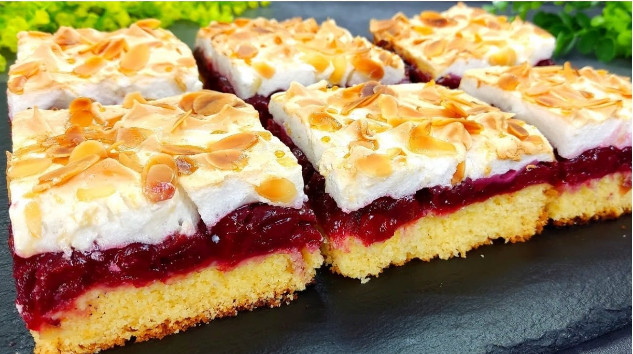 Za pripremu belog biskvita, umutite belanca sa prstohvatom soli dok ne dobijete čvrsti sneg. Ovaj proces je važan jer čvrsti sneg osigurava da biskvit bude lagan i vazdušast. Postepeno dodajte šećer i kukuruzni skrob, i nastavite mućenje dok smjesa ne postane glatka i sjajna. Rasporedite ovu smjesu po ohlađenom džemu od trešanja, a zatim pospite listićima badema. Bademi će dodati dodatnu teksturu i ukus, stvarajući kontrast između sočnog džema i laganog biskvita.
