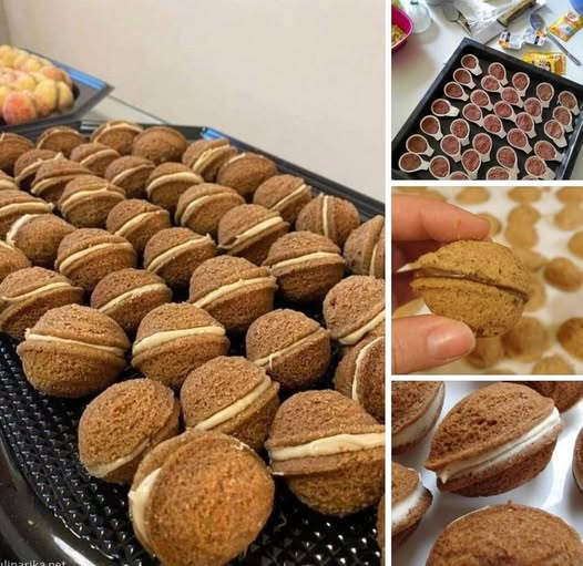 1. Za tijesto ostavite maslac da malo omekša. 2. Pomiješajte sve sastojke i otkidajte male komadiće koje ćete utisnuti u kalup, pazeći da tijesto ispuni udubinu bez prelijevanja. Nema potrebe mazati kalupe. 3. Kalupe složite u pleh i pecite na 180°C oko 20 minuta. Tijekom pečenja tijesto će malo narasti; međutim, ispuhat će se nakon hlađenja. 4. Za vađenje pečenih orašastih plodova dio lagano odvojite malim oštrim nožem i lako će ispasti. Ostavite ih da se potpuno ohlade. Ovaj proces će dati oko 80 polovica, što će rezultirati s 40 gotovih oraha.