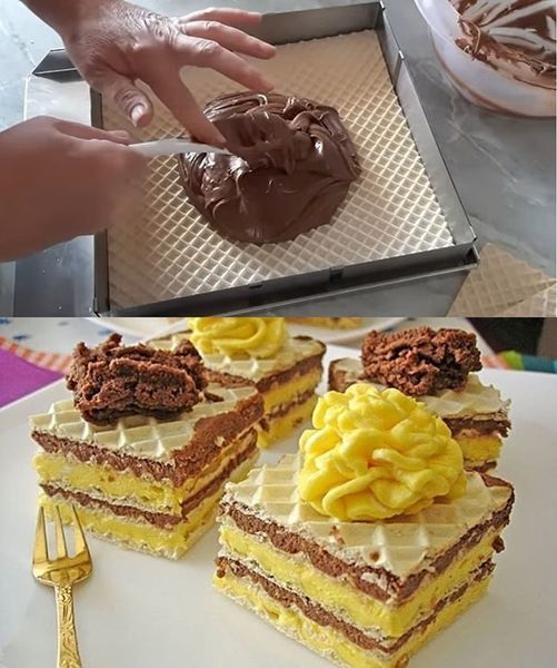 Naizmjenično slagati listove oblatni i nadjeve. Petu i zadnju oblatnu rukama čvrsto pritisnite da nadjev dobro prijanja. Stavite pleh na vrh i ostavite da se stegne. Prijeđite na rezanje sklopa na kocke. Preostalim nadjevom napunite šprice i pređite na ukrašavanje izrezanih kockica.