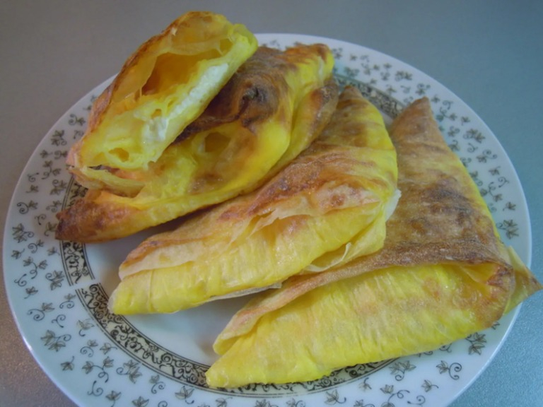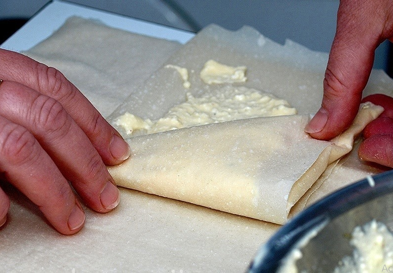 Kada ste pripremili nadjev, uzmite kore i prepolovite ih. Svaku koru pažljivo premazujte pripremljenim nadjevom. Savjetujem vam da ne štedite na nadjevu jer će tako pita biti sočnija i ukusnija. Kada premazujete koru, preklopite je na pola, potom opet premazujte nadjevom i ponavljajte postupak dok ne potrošite sve kore i nadjev. Uvijanje kora u oblik trokuta može izgledati komplikovano, ali nakon nekoliko pokušaja, sigurno ćete savladati tehniku. Pecite pitu u prethodno zagrijanoj pećnici na 200 stepeni oko 10-15 minuta, dok ne dobije zlatno smeđu boju.