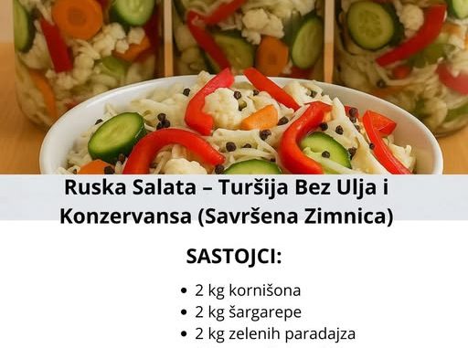 Ruska salata, poznata i kao turšija, neizostavan je deo bilješke svakog domaćinstva, posebno tokom zimskih meseci. Ova ukusna i šarena kombinacija povrća ne samo da zadovoljava nepce, već je i bogata hranljivim sastojcima. Spremanje ruske salate je tradicija koja se prenosi s generacije na generaciju, a njen značaj prevazilazi kulinarske okvire. Ova zimnica predstavlja simbol porodičnih okupljanja i svečanih obroka. Kada se povrće marinira, ono zadržava svoju hrskavost i bogatstvo ukusa, čime postaje savršen dodatak raznim jelima.