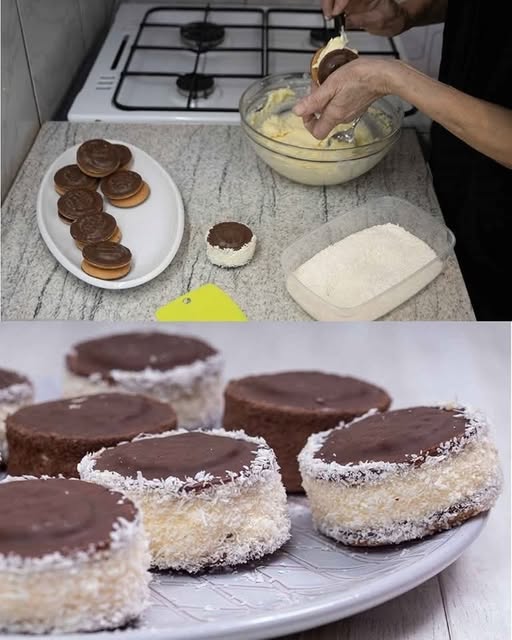 Na jednu stranu biskvita stavite žlicu nadjeva i spojite kekse. Pazite da vanjski rubovi keksa budu zaglađeni, a zatim ih premažite ili kokosovim brašnom ili čokoladom u prahu.