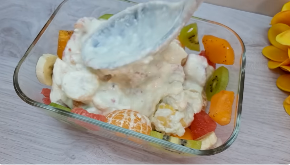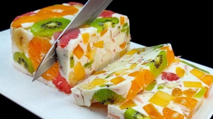 Recept zahtijeva različito voće, uključujući oguljene i odvojene mandarine, oguljeni i narezani kivi, oguljeni i narezani grejp, oguljeni i odvojeni grejp, jabuku bez koštice i nasjeckanu te oguljenu i narezanu bananu. Osim toga, trebat će vam 8 grama agar-agara, 50 mililitara vode, 350 mililitara mlijeka, 200 grama kondenziranog mlijeka i 200 grama kiselog vrhnja ili jogurta.