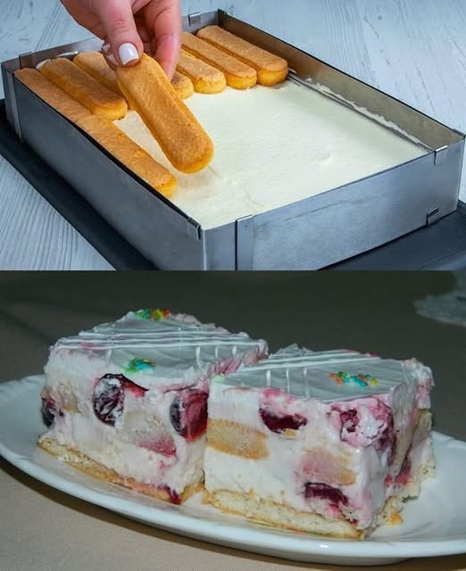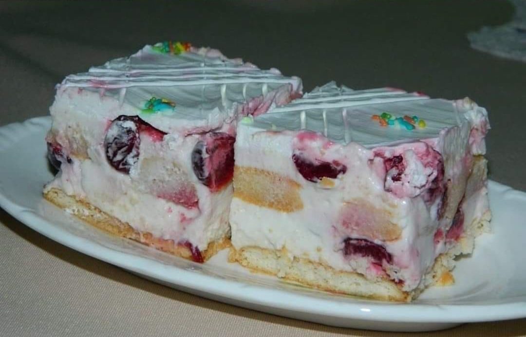 Za pripremu ovog recepta potrebna vam je pozamašna kutija keksa, voćni sok (kako za namakanje keksa tako i za daljnju upotrebu po potrebi), 100 grama bijele kreme, 100 mililitara gazirane vode, otprilike 400 grama višanja i jedna žlica griza.