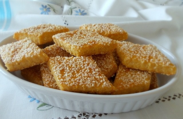 Nakon što ste premazali prvu stranu, prevrnite tijesto i ponovite postupak s premazivanjem i posipanjem susama. Tijesto potom isjecite na trakice željene širine, a zatim ih možete isjeći i u kockice ili rombove, zavisno od vaših preferencija.