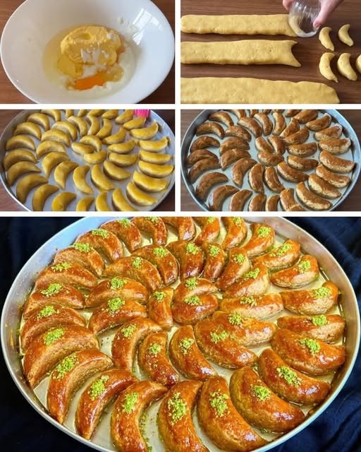 Tijesto podijeliti na 3 dijela, svaki razvaljati u cjepanicu i malo spljoštiti. Okruglom čašom izrežite oblike polumjeseca.