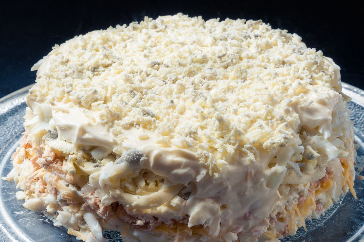 Sada je vreme da počnete sa složenjem vaše slane salate. Pripremite okrugli kalup ili posudu za posluživanje. Na dno kalupa stavite krupno narendani sir i tanko ga premažite majonezom. Na sir stavite sloj narendanih žumanaca, a zatim sloj pripremljenog luka. Ovaj sloj će dodati posebnu aromu i sočnost salati, čineći je još privlačnijom za konzumaciju.
