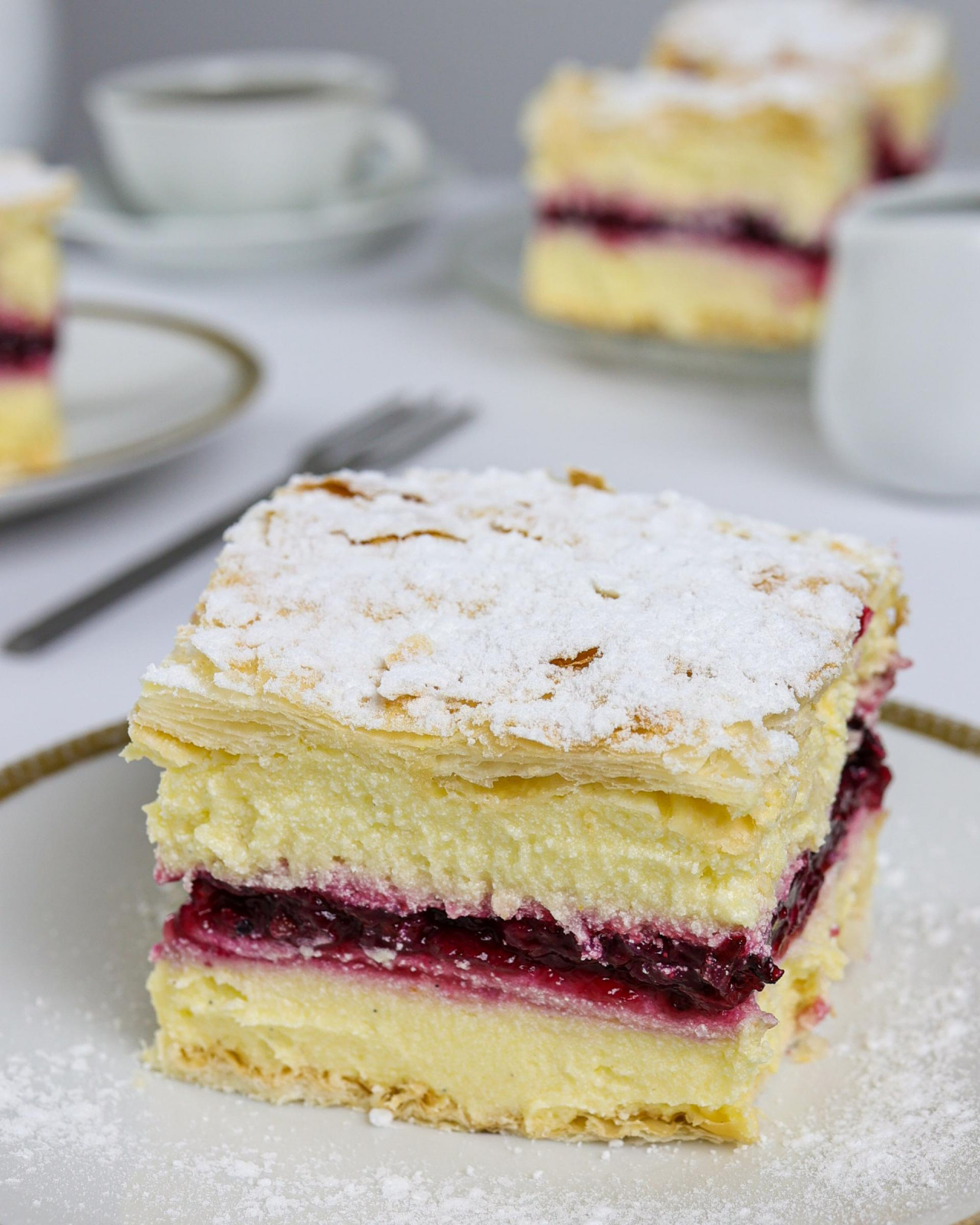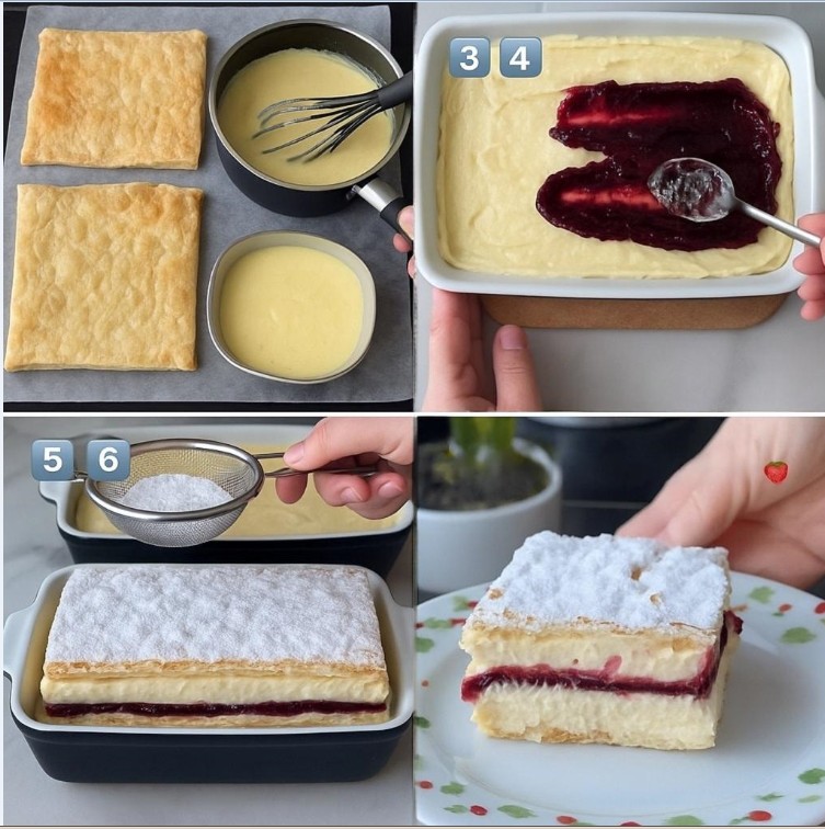Slaganje pite je ključni korak koji će definirati konačni izgled i ukus. U duboku tepsiju stavite prvi pečeni list lisnatog tijesta, a preko njega ravnomjerno rasporedite polovinu pripremljene vanila kreme. Na kremu stavite sloj voća, a zatim prelijte preostalom vanila kremom. Na samom kraju, stavite drugi pečeni list lisnatog tijesta na vrh. Nakon što ste složili sve slojeve, ostavite pitu da se ohladi na sobnoj temperaturi. Prije serviranja, pospite je prah šećerom radi dodatnog estetskog dojma i slatkog okusa. Ova pita je savršena za posluženje uz šolju kafe ili čaja, a njena hrskava tekstura i bogati ukusi zasigurno će oduševiti svakog gosta. Možete je poslužiti s dodatkom šlaga ili kuglicom sladoleda, što će dodatno obogatiti ukus i pružiti osvježavajući kontrast.Zaključak