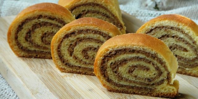 Kad je tijesto naraslo, razvaljajte ga valjkom za tijesto i namažite nadjevom po želji. Ovaj put sam jeo samo orahe. Tijesto sam razvaljala na velicinu dugackog valjka i namazala nadjevom kao na slikama. Lakše je zarolati sa svake strane pa rezati po sredini da se dobiju 2 štruce. Ja sam ih također prepolovila pa sam dobila 4 mala. Prebacite ih u podmazan pleh (ja koristim puter ili margarin)
